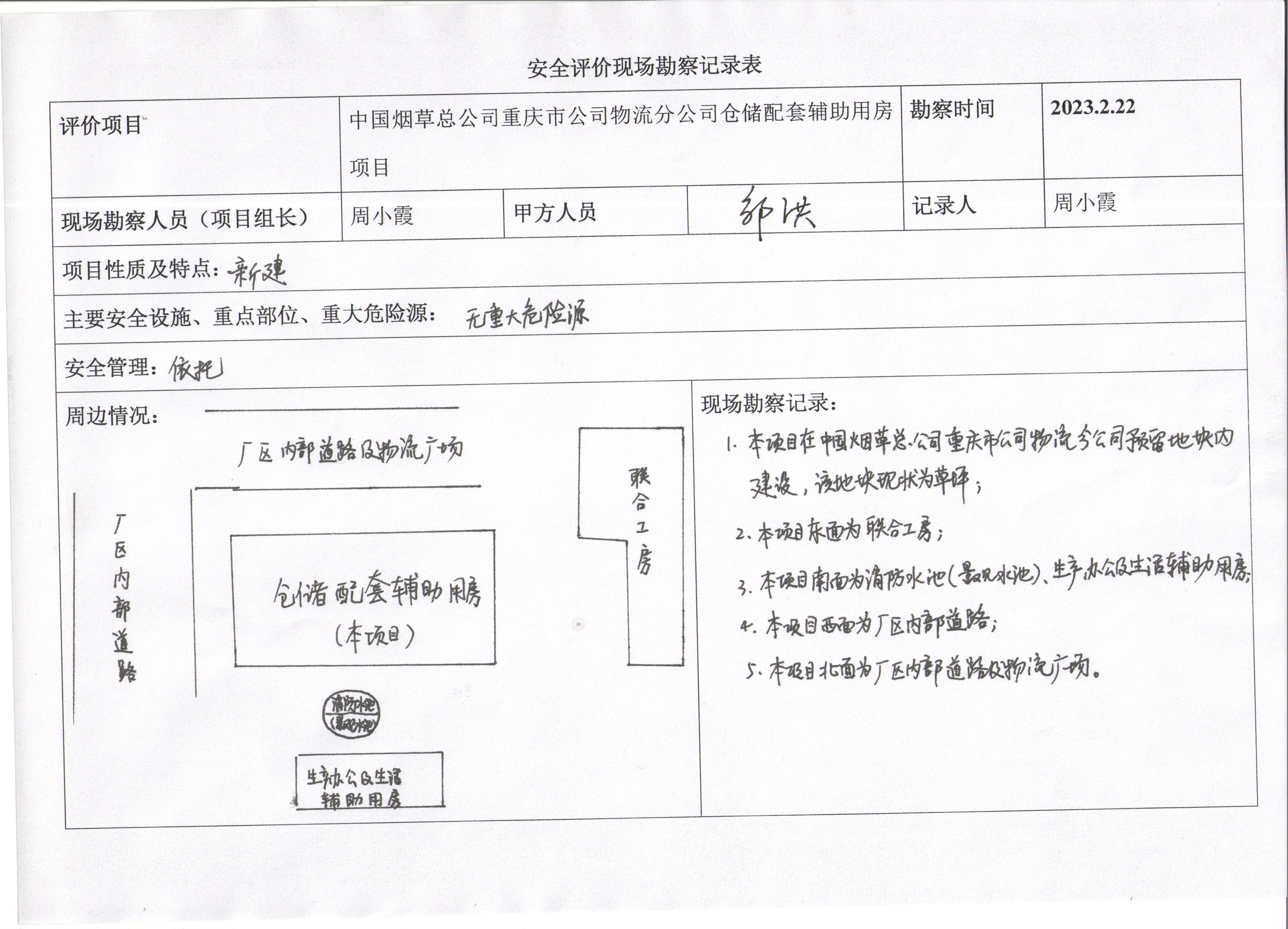 評價項目評價結論: 中國煙草總公司重慶市公司物流分公司在有效地落實方案設計和本安全生產條件和設施綜合分析報告提出的各項安全對策措施后,其新建配套輔助用房項目的安全生產條件符合國家相關安全生產法規、標準和規范要求,在項目建成實施后,企業存在的固有危險有害因素可控,在安全方面可行。 | ||||||||
