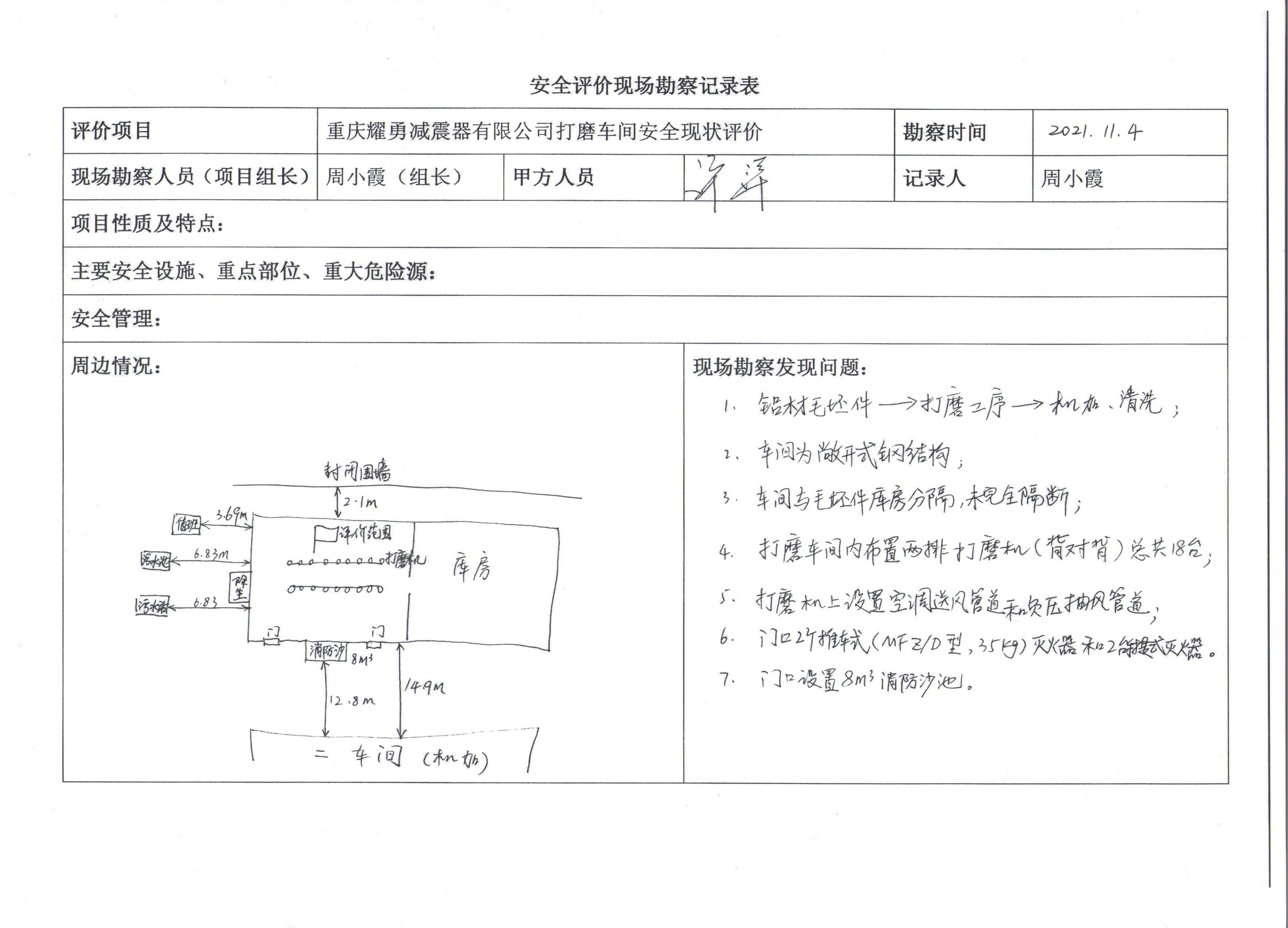 項目名稱 | 重慶耀勇減震器有限公司打磨車間安全現狀評價報告 | 合同編號 | DA(渝)-PJ-2021004 | |||||